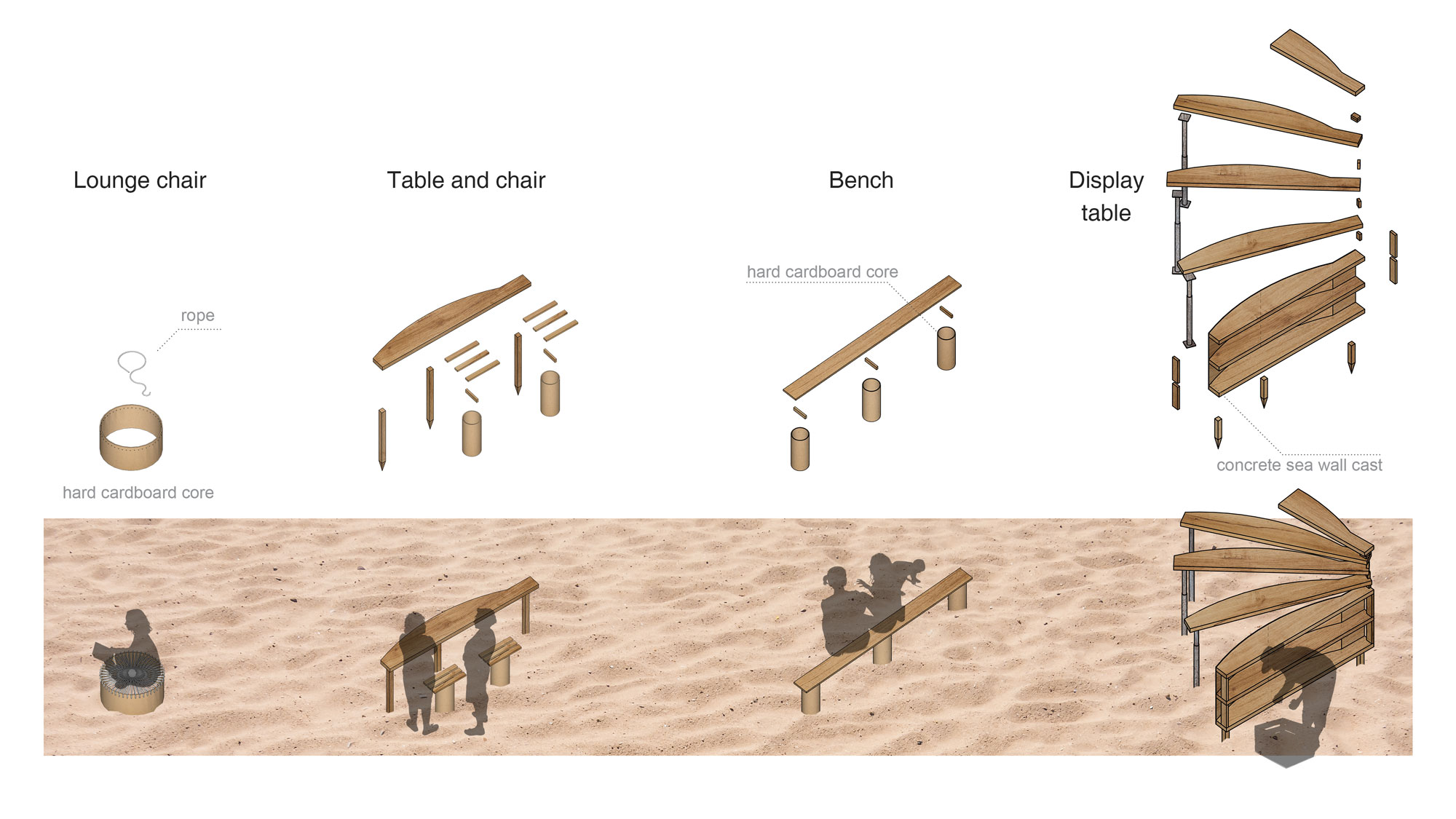 Using the leftover materials we collected around the island, we were able to make some moveable lightweight beach furnitures which can be put away in the shed nearby when not in use. The lounge chair, a last minute design of mine, proved to be a popular choice for the small children.